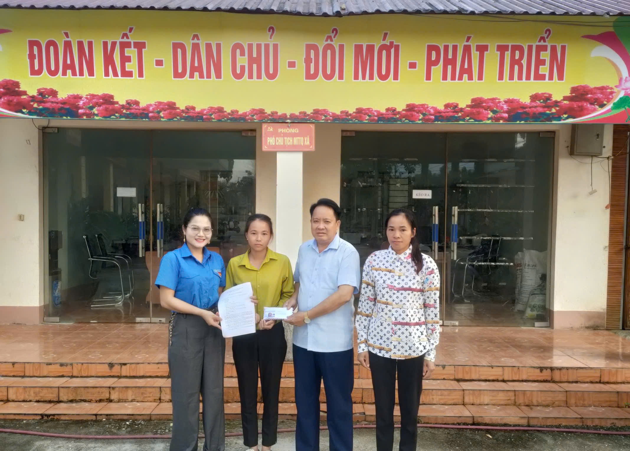 Đồng chí Hoàng Trọng Khoắn, Bí thư Đảng ủy, Chủ tịch HĐND xã và Đoàn TNCS Hồ Chí Minh xã Tiên Yên trao tiền hỗ trợ của các đơn vị tài trợ xây dựng nhà ở cho gia đình Bàn Thị Mai, thôn Sơn Thành