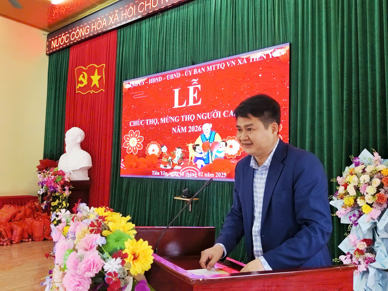 Đồng chí Nguyễn Văn Dũng, Phó Bí thư Đảng ủy, Chủ tịch UBND xã phải biểu tại Lễ chúc thọ